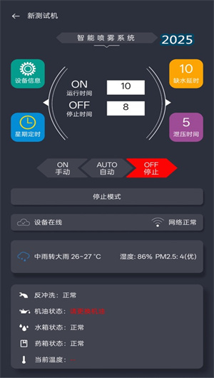 智能霧森的核心功能是其強大的遠程啟停能力與多機組網管理機制。用戶可通過平臺對分布在不同區域的噴霧設備進行遠程控制,無需現場操作即可完成開關機指令下發。系統支持將多臺設備納入統一的設備組網架構中,實現集中管控,用戶可在設備列表中批量操作或分組管理,極大提升了大規模部署場景下的操作效率。無論是單個設備的即時啟停,還是整個設備網絡的協同工作,均可通過這一一體化控制平臺輕松完成,為園林景觀、工業降塵等場景提供前所未有的管理便捷性。