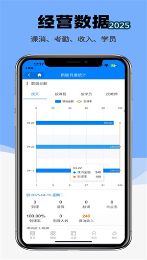 3. 數據驅動的精細化運營分析平臺:虎鯨愛學App最具價值的亮點是其強大的數據分析能力。系統通過多維度數據采集和智能分析,生成涵蓋招生轉化、學員留存、教師效能、課程熱度等方面的運營分析報告。機構管理者可以通過數據看板直觀了解經營狀況,識別業務瓶頸,優化運營策略。基于歷史數據的趨勢預測功能,還能為機構的課程設置、師資配置和營銷投入提供決策參考,幫助機構實現精細化運營。
