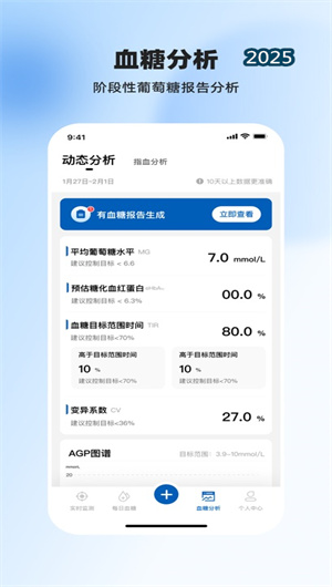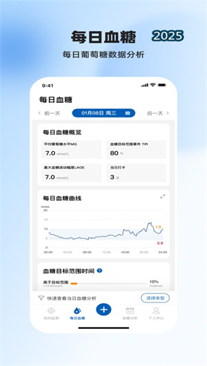 2. 多時間維度趨勢分析與可視化圖表呈現:本App提供了強大的圖表分析工具,支持用戶按 “每天”、 “每周”、 “每個月” 等多種時間粒度,直觀地查看血糖數據的變化趨勢。系統會自動計算并顯示平均血糖、血糖在目標范圍內時間百分比及血糖波動系數等關鍵指標,并通過清晰的趨勢曲線和數據表格進行可視化呈現,幫助用戶從宏觀上了解數據變化規律,識別潛在的風險模式。
