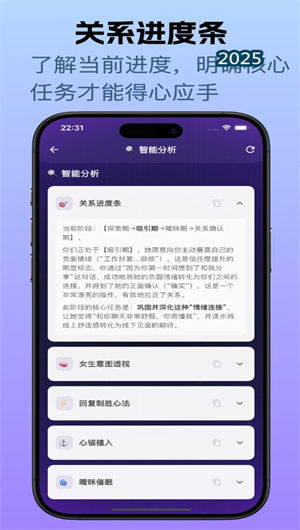 軍師戀盟的突出亮點在于其全面的關系診斷能力,系統從情感投入、互動頻率、回應質量等多個維度評估關系狀態,并基于診斷結果生成個性化的推進策略。平臺不僅關注單次對話質量,更注重長期關系的健康發展,提供從破冰技巧到深度連接的全套解決方案。這種系統化的指導模式確保了關系發展的穩定性與可持續性,避免了碎片化建議可能帶來的不一致問題。