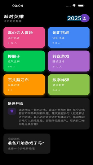 派對(duì)超人是一款專(zhuān)為現(xiàn)代社交聚會(huì)設(shè)計(jì)的全能型娛樂(lè)應(yīng)用,以成為聚會(huì)中的"氣氛發(fā)動(dòng)機(jī)"為核心產(chǎn)品理念,通過(guò)數(shù)字技術(shù)創(chuàng)新地重塑了傳統(tǒng)聚會(huì)娛樂(lè)體驗(yàn)。本應(yīng)用深度融合游戲引擎與社交互動(dòng)元素,針對(duì)朋友聚會(huì)、生日派對(duì)、團(tuán)隊(duì)破冰等多元場(chǎng)景,提供了一系列即開(kāi)即用的互動(dòng)游戲與氣氛升溫解決方案。無(wú)論是KTV、露營(yíng)、酒吧還是家庭場(chǎng)景,派對(duì)超人都能通過(guò)其豐富的游戲庫(kù)與智能的參與機(jī)制,快速打破社交尷尬,激發(fā)群體活力,讓每一次聚會(huì)都成為難忘的歡樂(lè)體驗(yàn)。