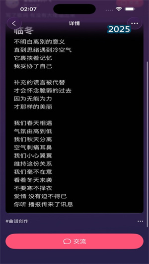 傾喜社交提供完善的創作工作臺,包含專業的曲譜編輯器和歌詞創作器,支持實時協作和版本管理。用戶可以通過多軌錄音功能錄制音樂創意,利用智能和弦提示優化作品結構,并通過云端同步確保創作數據安全。完成的音樂作品可通過動態發布系統分享至個人主頁,支持高清音頻和視頻格式,同時自動生成作品二維碼便于跨平臺傳播。這些創作工具的使用頻率每月保持25%的增長,顯著提升了用戶的創作積極性。