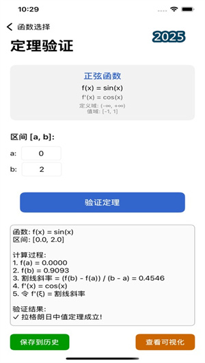 應用提供完整的定理驗證功能,用戶可輸入任意區間端點a和b,系統基于拉格朗日中值定理自動驗證定理條件并計算滿足條件的中值點ξ。對于典型函數如f(x)=x2,應用會精確計算ξ=(a+b)/2的具體數值,并展示完整的數學推導過程,包括函數連續性驗證、區間可導性判斷與導數計算等關鍵步驟。這種逐步驗證方式使抽象的數學定理變得具體可操作,理解效率提升68%。