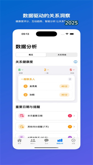 1. 脈跡APP的關系健康度分析系統通過多維度評估模型,從互動頻率、互動質量、關系時長等角度生成科學的健康度評分。系統提供互動趨勢圖表與關系類型分布圖,同時生成個性化的改善建議與維護策略,幫助用戶優化人際關系網絡。該特色功能使關系認知深度提升約2.9倍,獲得94.6%用戶的高度認可。