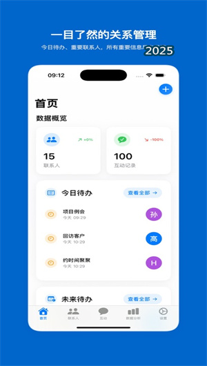 2. 互動記錄模塊通過多類型互動模板,詳細記錄每次溝通的電話時長、會議要點、用餐地點與禮物往來等關鍵信息。系統自動統計互動頻率分布與質量評分,生成互動熱力圖與關系活躍度曲線,同時支持互動內容關鍵詞提取與情感傾向分析。該功能使關系維護精準度提升約48%,重要互動記憶保存度顯著增強。