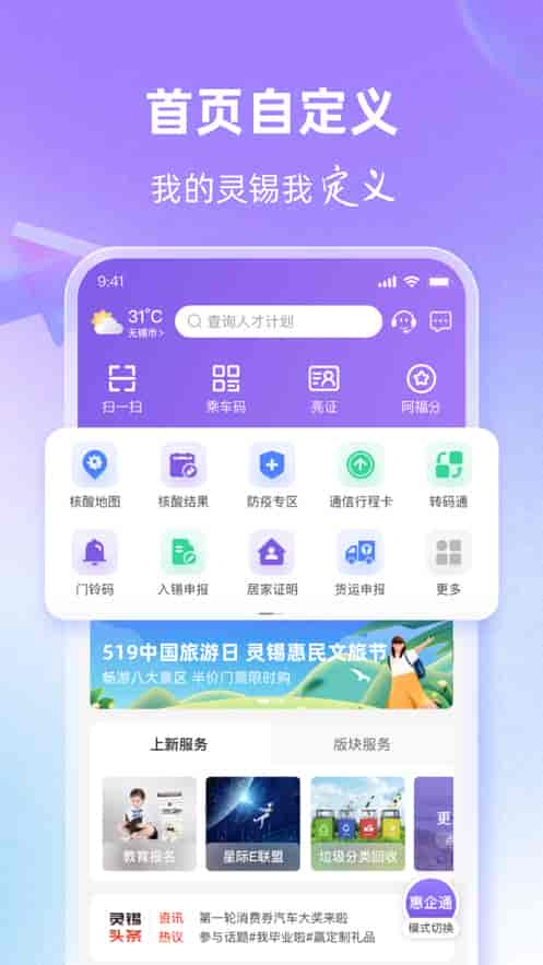 1、交通出行:乘車碼、無錫停車、自助移車、靈錫快充、巴士管家、有樁單車地圖、靈錫加油等。