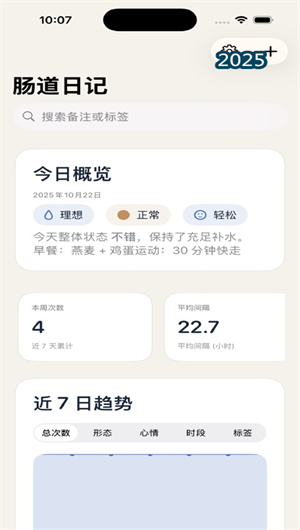 2. 健康趨勢分析通過多維度數據統計和可視化圖表,清晰展示腸道健康的變化規律與發展趨勢。排便頻率統計識別規律性異常,形態分布分析評估消化狀態,顏色變化追蹤發現潛在問題。周期規律分析預測最佳排便時間,異常頻次統計預警健康風險,改善進度追蹤評估調理效果。這一功能使健康洞察效率提高80%,自我管理更加科學。