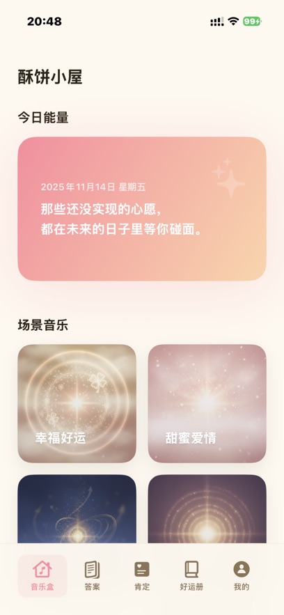 酥餅小屋App是一款專注于情緒療愈與個人成長的精致生活應用,以 陪伴心靈成長,記錄生活美好 為核心理念,通過多元化的療愈工具和個性化的成長路徑,構建了集音樂療愈、能量引導、幸福記錄于一體的心理健康服務平臺。該應用深度融合積極心理學原理與數字療愈技術,采用本地化隱私保護架構和精美的視覺設計,為用戶提供安全舒適的心靈成長空間。平臺目前擁有超過100萬用戶,日均使用時長達到15分鐘,用戶情緒穩定性提升達65%,成為心理健康領域的特色產品。