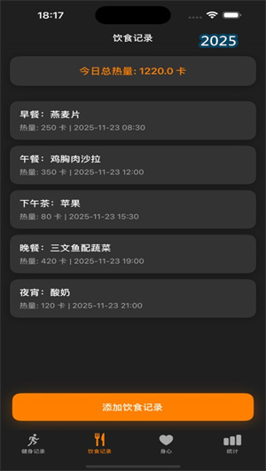 1. 精準高效的飲食管理與熱量監控:在飲食記錄模塊,看門狗App提供了極其便捷的食物錄入體驗。用戶可快速輸入食物名稱與對應的熱量數值,系統會即時在界面頂部以數據看板的形式實時顯示今日總熱量攝入,形成強烈的量化認知。每條記錄均以卡片式展示,支持詳情的查看、編輯與刪除操作,確保了管理的靈活性。更重要的是,所有飲食數據均通過本地持久化保存技術存儲于用戶設備中,不僅保障了隱私安全,也使得日常的熱量監控與回顧變得輕松而可靠,為科學的飲食規劃奠定了堅實基礎。