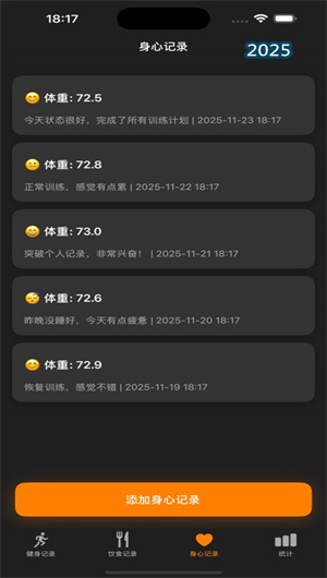 3. 多維度的身心狀態追蹤與情緒日志:看門狗App創新性地將身體指標與心理感受相結合,設立了身心記錄模塊。用戶可以通過底部直觀的按鈕選擇當下的心情貼圖,并同步錄入體重數據與記錄感受的備注。所有歷史記錄以時間線列表形式展示,清晰呈現心情變化與體重趨勢的關聯。這種長期的數據追蹤為用戶提供了一份寶貴的情緒日志,幫助他們洞察自身狀態的變化規律,為實現真正的全面健康管理提供了不可或缺的定性及定量數據支持。