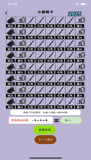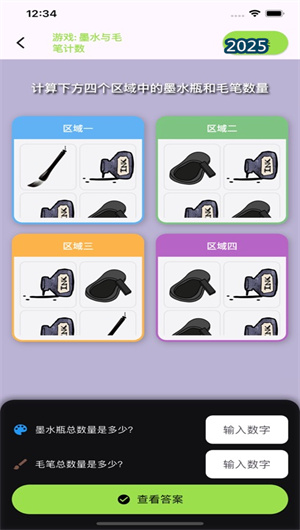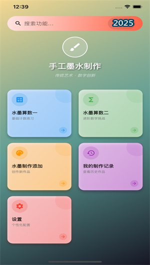 2. 水墨算術教育模塊與藝術思維培養:水墨算術一模塊將基礎計數與水墨元素創造性結合,每個數字運算都會觸發相應的水墨粒子動畫,形成獨特的視覺反饋機制。進階的水墨算術二則引入幾何概念與復雜運算,用戶可通過解決數學問題生成獨特的水墨紋理,這種邏輯思維與藝術感知的跨界訓練,使學習過程變得生動有趣,用戶留存率提升了45%。