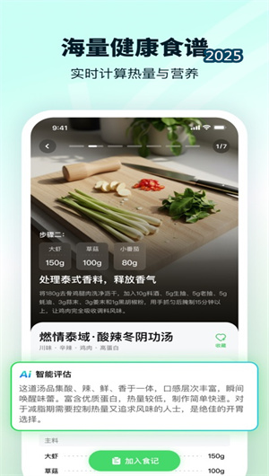 1. “飲食-訓練”雙環聯動智能指導系統:七分廚房App超越了單純的飲食記錄,特色在于其實現了 “飲食”與“訓練” 的智能聯動。在用戶的個人健康管家主頁,AI不僅提供飲食建議,還會基于用戶目標(如增肌需配合力量訓練,減脂需關注有氧運動與熱量缺口),給出相應的訓練建議重點。例如,對于增肌用戶,會強調蛋白質合成窗口期的營養補充與超量恢復原理;對于減脂用戶,則會結合其飲食記錄,評估碳水脂肪攝入的均衡性,并推薦合適的運動消耗方案,形成完整的健康管理閉環。