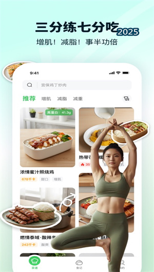 2. 智能化食譜庫與精準營養分析引擎:應用擁有一個龐大的 “海量健康食譜庫” ,所有食譜均按照增肌餐、減脂餐、低碳水食譜、高蛋白食譜等標簽進行科學分類。每個食譜卡片都詳細展示食材精確配比、分步烹飪指南、預估烹飪時間以及由營養分析引擎實時計算出的卡路里熱量與詳細營養成分表(包括蛋白質、碳水化合物、脂肪、膳食纖維及微量營養素含量)。用戶可以根據自己的熱量預算和營養素目標,像逛超市一樣方便地篩選和規劃一日三餐,讓每一餐都吃得明明白白。