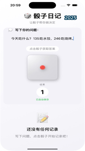 1. 即時(shí)隨機(jī)決策生成與趣味交互:用戶在骰子日記中,只需在簡(jiǎn)潔的輸入框內(nèi)錄入一個(gè)二元或多元選擇題(如“晚餐:A.面條 B.米飯 C.餃子”),然后點(diǎn)擊屏幕中央擬物化設(shè)計(jì)的 “3D虛擬骰子” 。應(yīng)用內(nèi)置的高熵隨機(jī)數(shù)算法將瞬間模擬真實(shí)骰子的物理隨機(jī)性,生成一個(gè)1至6之間的隨機(jī)點(diǎn)數(shù)結(jié)果。這個(gè)結(jié)果會(huì)以醒目的動(dòng)畫(huà)形式呈現(xiàn),為用戶提供直接的 “骰子建議” 。整個(gè)流程在數(shù)秒內(nèi)完成,將決策過(guò)程從一個(gè)糾結(jié)的內(nèi)耗,轉(zhuǎn)化為一場(chǎng)充滿懸念和趣味性的微型儀式。