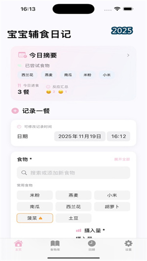 1. 精細化膳食日志與多樣性追蹤:本功能提供結構化輔食日記模板,允許家長按喂養時段(如早餐、午餐、點心)詳細記錄每一餐的食物種類、食材分量(支持克、勺等計量單位換算)、烹飪方式及食物質地(如泥狀、碎末、手指食物)。系統內置嬰幼兒食物庫,涵蓋數百種常見食材,并通過飲食多樣性評分算法,自動計算寶寶當日攝入的食物種類數與食物組覆蓋率(如谷物、蔬菜、水果、蛋白質等)。例如,連續記錄一周后,系統會生成膳食彩虹圖,直觀展示飲食均衡情況,并提示如“本周深色蔬菜攝入頻次不足”等個性化建議,幫助家長系統性地提升寶寶飲食多樣性。