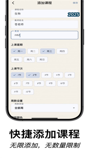 2. 全功能課程數(shù)據(jù)編輯與管理功能:應(yīng)用提供強大且直觀的課程信息管理套件。用戶可通過手動課程錄入表單靈活添加每一門課程的詳細(xì)信息,并利用課程卡片編輯界面隨時進行修改或刪除。針對規(guī)律性課程,批量課程設(shè)置工具支持用戶快速復(fù)制課程模板至指定周期(如單雙周、每周固定幾天),極大提升排課效率。所有課程支持自定義顏色編碼系統(tǒng),用戶可為不同學(xué)科分配專屬色塊,從而在課表視圖中實現(xiàn)快速的視覺科目分類辨識。