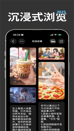 2. 極速記錄入口與沉浸式故事回顧功能:應用貫徹快速啟動的設計原則,用戶不僅可以從主App進入,更可將核心的“快速記錄小組件” 添加至手機桌面,或將“一鍵拍攝控制中心快捷指令” 集成到手機下拉菜單,實現無需打開完整App即可秒速拍照記錄,最大化降低記錄行為的啟動門檻。在回顧端,應用提供沉浸式全屏故事瀏覽模式,所有記錄按時間軸順序排列,用戶可以通過流暢的滑動,如同翻閱一本精美的個人飲食日記一樣,回溯過往的飲食生活點滴,界面純凈無干擾,專注于食物影像與故事本身。