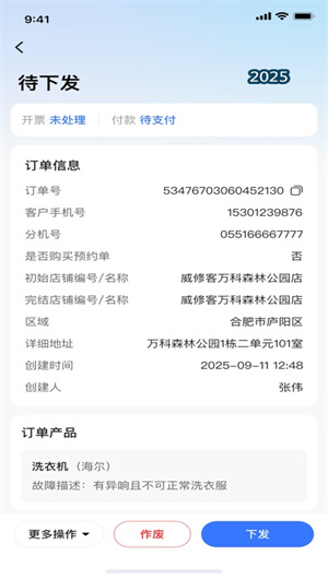 系統管理員在 《一點燈火》管理后臺 可便捷地為不同職能員工創建對應角色的系統賬號。客服賬號擁有接聽客戶咨詢、錄入服務需求、創建標準化工單(包含服務地址、時間、項目、價格、客戶特殊要求等)的權限。工單創建后,客服可根據預設規則(如區域、工種、師傅忙閑狀態)選擇 “系統智能派單”,或手動指派給特定的區域經理進行二次調度。所有工單下發操作均有記錄,確保責任可追溯。系統支持批量創建訂單、模板化快速下單及預約單管理,提升客服工作效率。
