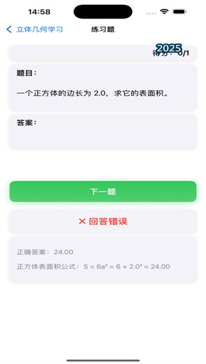 為鞏固所學,《幾何立方體》App提供了強大的 “自適應練習題訓練引擎”。引擎能夠根據用戶的學習進度和薄弱環節,自動生成涵蓋不同圖形、不同難度(求體積、求表面積、已知部分參數求另一參數等)的題目。提交答案后,系統會進行 “智能容差判定”(考慮計算精度誤差),并立即給出詳盡解析,包括所用公式、解題思路和關鍵步驟。所有答錯的題目會自動收錄至 “云端錯題本”,并可由用戶手動標記為 “未掌握” 或 “已掌握”,方便進行針對性復習。同時,所有使用計算器的操作均被記錄在 “計算歷史” 中,可隨時回看參數、公式與結果,便于復盤。
