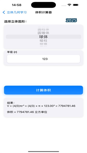 App內置的 “智能參數化圖形計算器” 是其最具實用價值的功能之一。用戶只需在界面中根據提示,選擇圖形類型(如圓錐體),并輸入相應的參數(如底面半徑、高),計算器便會自動調用對應的 “體積公式” 或 “表面積公式” 進行運算。更為出色的是,它并非簡單地輸出結果,而是會以分步展開的形式,清晰展示完整的公式計算過程,包括代入數值、中間運算步驟直至最終結果。這相當于一位隨時在線的“解題老師”,讓用戶不僅知其然,更知其所以然。計算器支持上述 8種常見立體圖形的快速切換與計算。