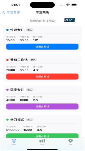 專注音律支持高度個性化的專注場景構建,用戶可根據不同的任務類型與個人偏好創建專屬的場景配置文件。每個場景包含計時設置組合(專注時長/休息間隔/循環次數)、音效搭配方案(主音效/背景音/提示音)、視覺主題選擇(界面顏色/動態背景/進度顯示樣式)及專注目標設定(任務描述/預期產出/重要性評級)。系統提供場景模板庫,收錄了針對創意寫作、編程開發、學術閱讀、語言學習等常見任務的優化場景配置,用戶可直接使用或基于模板微調。創建的場景支持一鍵切換與快速啟動,用戶還可將優質場景分享至社區或導入他人分享的場景,形成不斷豐富的專注場景生態。
