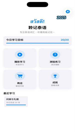 應用內置了高效的單詞測驗模式,每次測驗由系統從智能詞庫中動態抽取10道題目,形式包括泰漢選擇配對、聽音選義等,并在答題后提供即時反饋與詳盡解析。測驗成績將轉化為直觀的應用內金幣獎勵,直接與學習成果掛鉤,構成游戲化學習體驗的核心激勵循環。同時,完善的學習進度追蹤面板會以圖表形式清晰展示每個詞匯主題單元的學習正確率與歷史表現,幫助學習者精準定位記憶弱項與聲調難點。積累的金幣可用于解鎖新的詞匯書,這種“學習-測驗-獎勵-解鎖”的閉環設計,使學習動力提升了約35%。