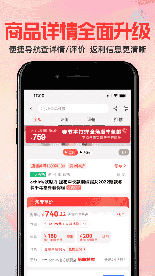 3、商品詳情全面升級,便捷導(dǎo)航查詳情、評價,返利信息更清晰。