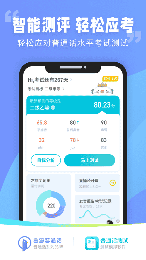 1、平臺智能測評輕松應(yīng)對普通話水平考試,名師課堂導(dǎo)讀專業(yè)指導(dǎo),學(xué)好普通話發(fā)音快人一步。