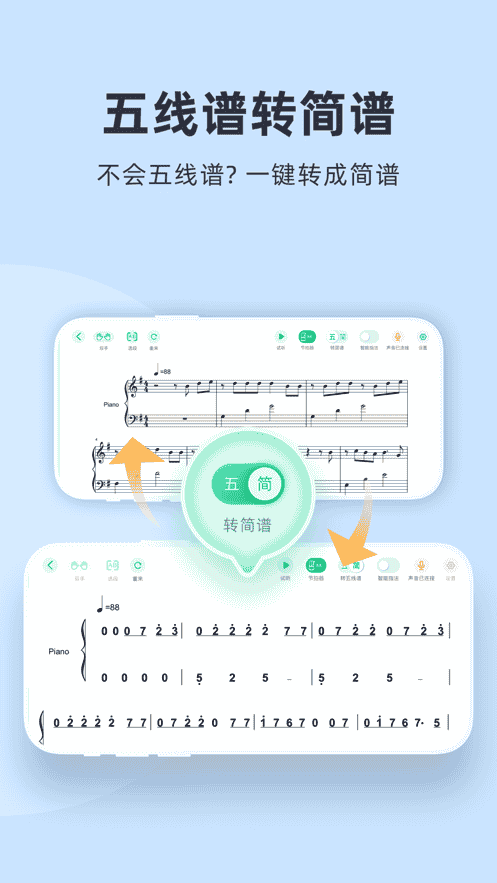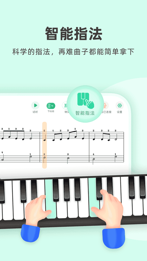 1、高效識譜效率翻倍,彈對音符變綠,彈錯立馬有提示,看不懂五線譜和指法的成人可以隨時切換簡譜,輕松認識五線譜。
