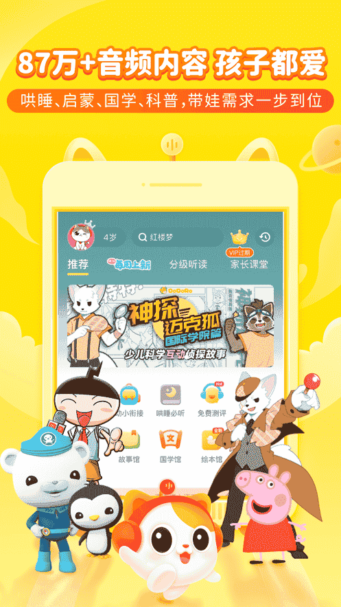 1、海量音頻內容專為兒童打造,有趣的、科學的、專業的,從“聽”開始模仿表達。