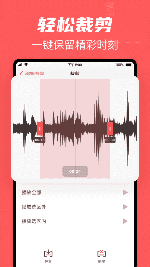 3、輕松裁剪,一鍵保留精彩時刻,特色錄音模式,想怎么聽就怎么錄,專業音頻編輯,簡單易用輕松上手。