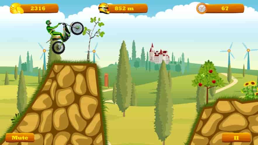 1、玩家通過控制摩托車的加速、剎車和轉向,躲避障礙物、跳躍和翻滾,盡可能地跑得更遠,獲得更高的分數。
