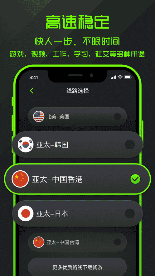 1、高速穩定快捷,游戲、視頻、工作、學習、社交等用途無限。線路選擇北美-美國-亞太-韓國-亞太-中國-香港-日本-亞太-中國-臺灣省更多優質路經下載旅游。