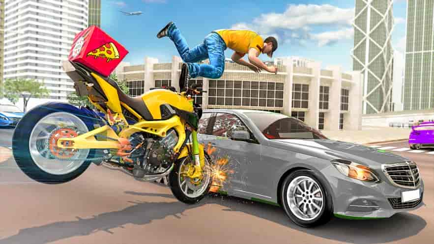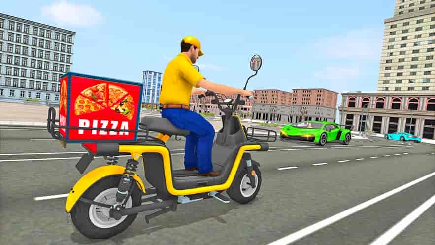 1、玩家需要駕駛自行車送披薩,通過(guò)控制方向盤和加速器,讓自行車行駛在道路上。