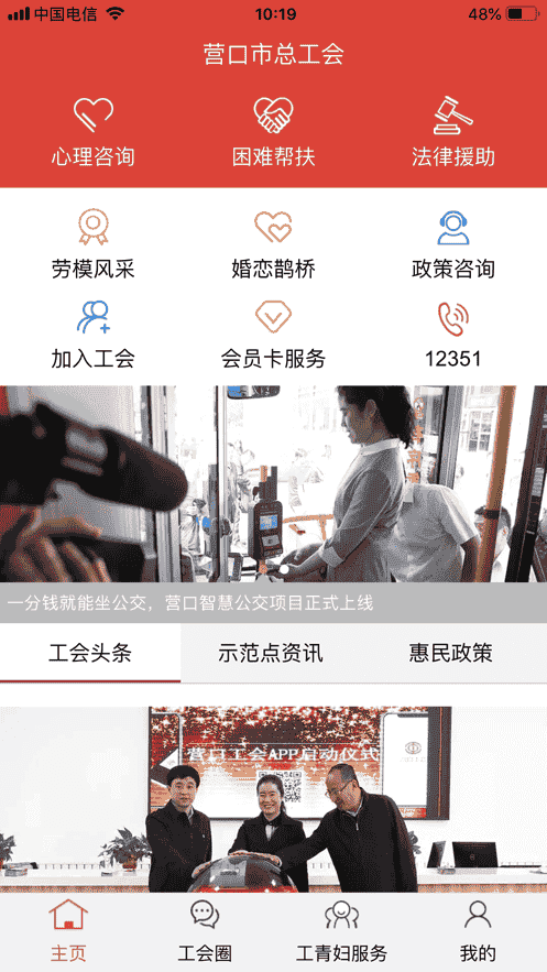 營(yíng)口工會(huì)App是一款集工會(huì)頭條、新聞動(dòng)態(tài)、心理咨詢、困難幫扶、法律援助、勞模風(fēng)采、婚戀鵲橋、政策咨詢、會(huì)員卡服務(wù)、12351熱線、技能培訓(xùn)、志愿者活動(dòng)、青少年服務(wù)、就業(yè)服務(wù)、家庭服務(wù)等多功能于一體的服務(wù)平臺(tái)。為工會(huì)會(huì)員提供了一個(gè)全方位、便捷的服務(wù)體驗(yàn)。