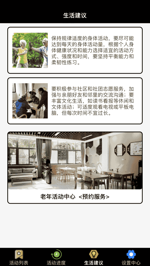 豐富的活動(dòng)資源:App提供各類養(yǎng)老活動(dòng)信息,滿足老年人不同興趣愛(ài)好的需求。