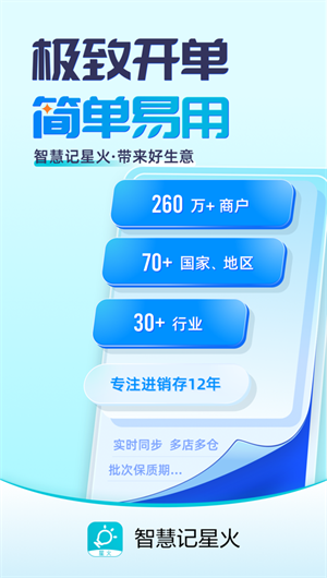 金蝶智慧記星火App是由金蝶智慧科技(深圳)有限公司精心打造的一款面向個體工商戶及小微企業的SaaS化智慧經營服務應用。以“進銷存”為核心,深入商戶的經營場景,實現數字化生意轉型,旨在幫助廣大商戶做好生意,增強經營活力。