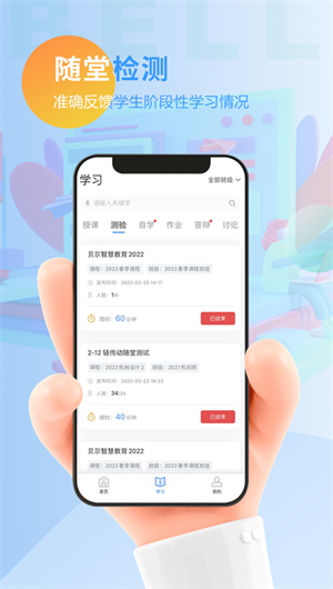 貝爾智慧教育App是一款專門為高校教育而設計的一體化在線學習平臺,擁有課堂互動、隨堂測驗、課后自學、作業互評等功能。在學生使用APP的同時,系統全程記錄學生的學習過程數據,為教師提供全方位的分析依據和教學評價標準,有效提升教學質量和學習效果。