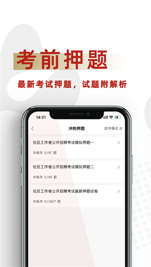 豐富的題庫(kù):收錄了大量的社區(qū)工作者,網(wǎng)格員,社工等職位的考試題目,且持續(xù)更新,滿足用戶的各種學(xué)習(xí)需求。