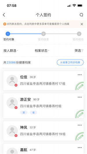 簽約管理: 提供面對面簽約、以家庭為單位的簽約,獲取居民的簽約申請,簽約記錄清晰可見,使簽約居民更好管理。